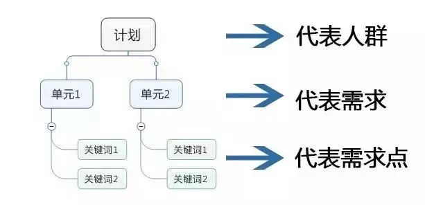 其实,在搭建账户时,我们可以把每个计划看做一类人群,每个单元代表着一类需求,每个关键词又代表着一个需求点;那我们在搭建的过程中就可以根据用户的需求点,撰写创意、分配预算和流量。
